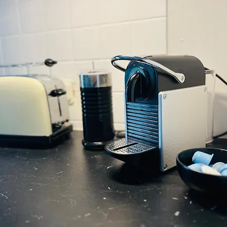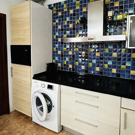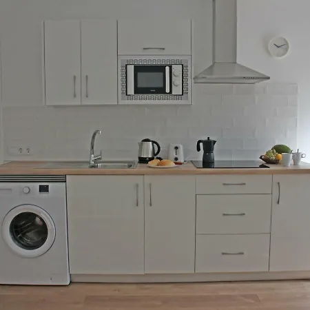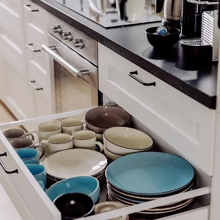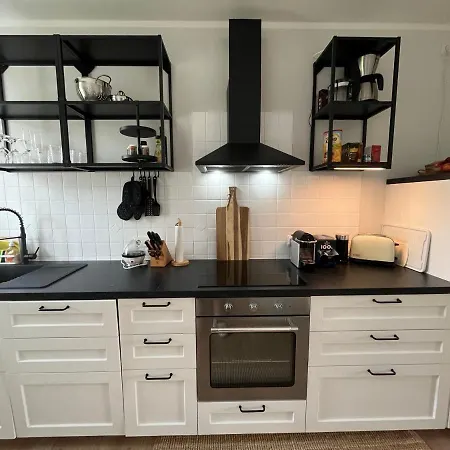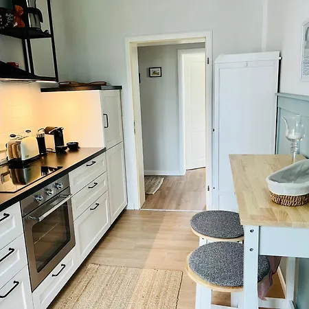 Eine voll ausgestattete Küche ist im Apartment Beste Lage mit Warnowblick - großer Balkon, zwei Schlafzimmer, Aufzug, Stellplatz ebenso vorhanden wie ein Herd und ein Geschirrspüler darauf. Die Bushaltestelle Faehrstrasse Michaelshof befindet sich auch in der Nähe, und zwar etwa 5 Minuten zu Fuß vom Apartment entfernt.
